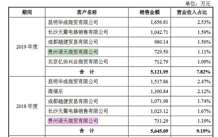 除了瘋狂擴張帶來的產能過剩隱患,億田智能的財務數據真實性也值考量。億田智能稱,貴州諾天商貿有限公司是發行人主要客户之一,2018年向億田智能採購731萬元,2019年採購729萬元。
