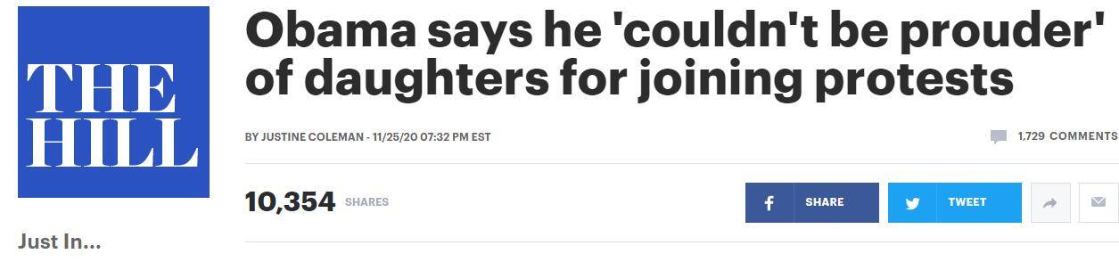 (《國會山報》:奧巴馬説,對於女兒們參與抗議活動一事,他感到非常自豪)