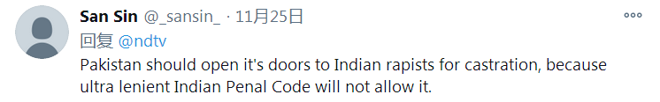 還有人説,“巴基斯坦應該向印度強姦犯敞開閹割的大門,因為極度寬大的印度刑法不允許這樣做。” ↓