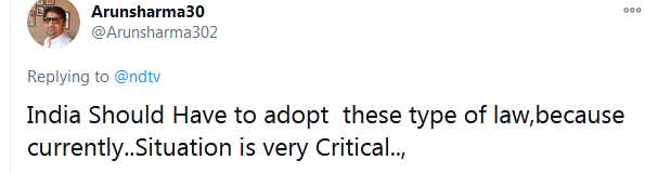 印度網友Arunsharma30表示:“印度應該採取這樣的法律,因為(印度)目前形勢非常危急。”↓