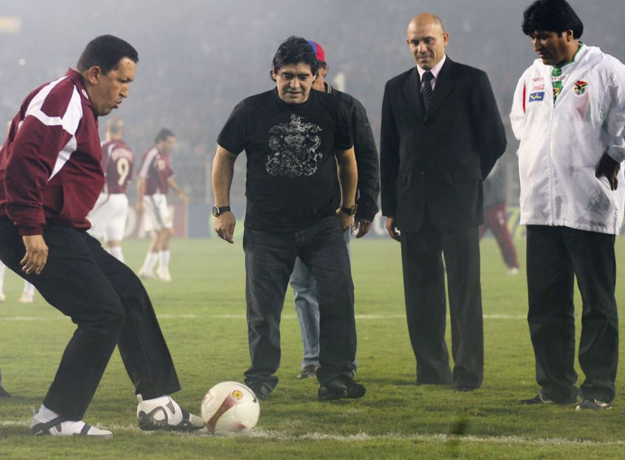 2007年委內瑞拉美洲盃上,馬拉多納(左二)與時任委內瑞拉總統查韋斯(左一)、時任玻利維亞總統莫拉萊斯(右一)為揭幕戰開球。