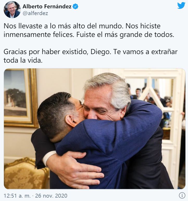 阿根廷總統阿爾韋託·費爾南德斯發推哀悼,並配上自己與馬拉多納的合影。
