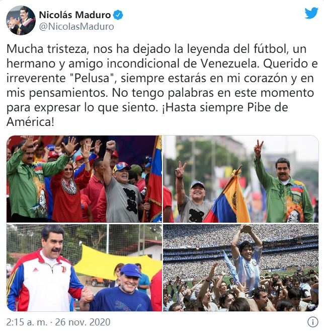 委內瑞拉總統馬杜羅發推哀悼馬拉多納,並配上兩人的合影以及馬拉多納1986年世界盃奪冠時的照片。
