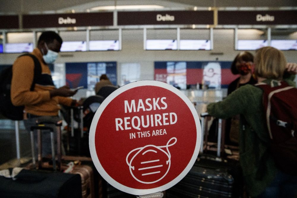11月24日,在美國弗吉尼亞州阿靈頓的里根國家機場,戴口罩的旅客們站在一處要求佩戴口罩的標識旁。(新華社發,沈霆攝)