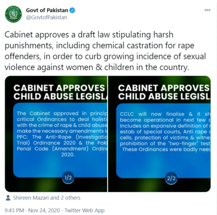 11月24日晚9點43分,巴基斯坦政府在其官方推特上發佈了一則聲明。聲明稱,巴基斯坦內閣批准了一項立法草案,草案中規定了嚴厲的刑罰,其中包括對強姦犯進行化學閹割,以此遏制巴基斯坦境內不斷增長的針對婦女、兒童的性侵案件。