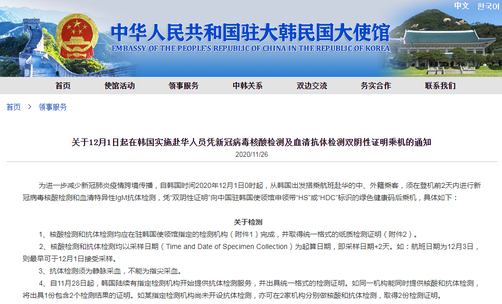 中國駐韓國使館:12月1日起自韓國赴華乘客須在登機前2天內檢測,憑“雙陰性證明”乘機