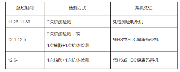 3、自12月6日0時起,統一實行1次核酸檢測+1次抗體檢測並申領健康碼的乘機措施。
