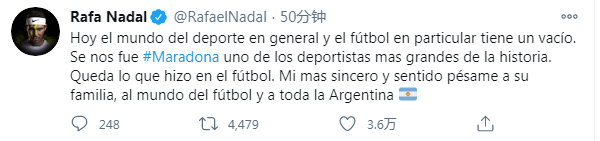 西班牙網球球星納達爾在其個人社交網站上發文悼念阿根廷球王馬拉多納。“今天整個體育界特別是足球界失去了一位重要人物。馬拉多納,歷史上最偉大的足球運動員之一,在今天離開了我們。他為足球運動做出的貢獻不會消失。我向他的家人、足球界和整個阿根廷表達最深的哀悼。”
