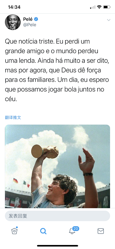 巴西球星貝利在其社交媒體賬號發文對馬拉多納去世表示哀悼,他説,希望有一天能在天堂和馬拉多納一起踢球。