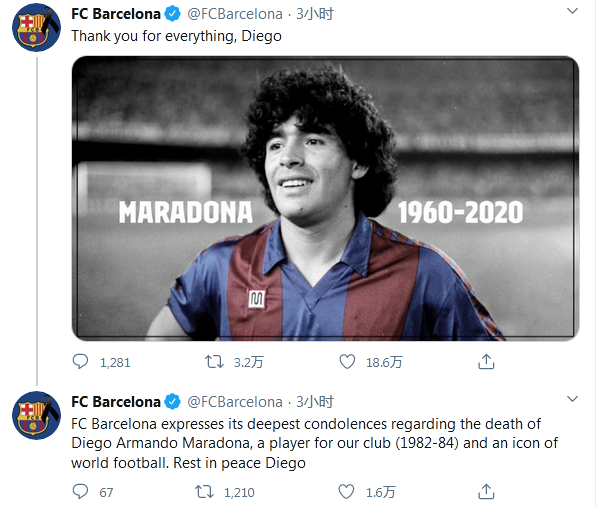 巴塞羅那足球俱樂部發文“感謝他所做的一切”,稱“對馬拉多納的逝世表示最深切的哀悼,他是我們俱樂部的球員(1982-84),也是世界足球的象徵。安息吧,迭戈。”↓