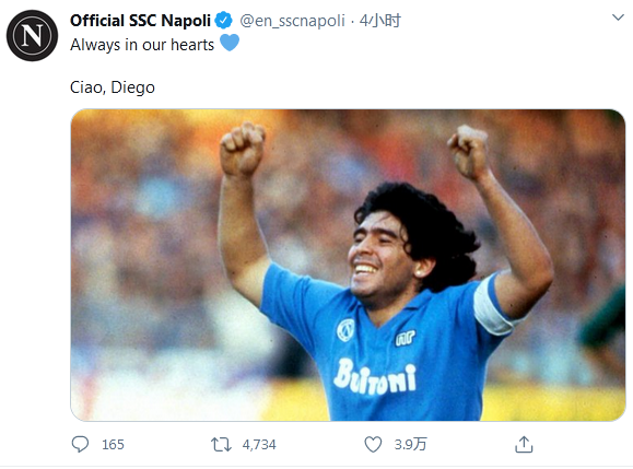 而意大利那不勒斯足球俱樂部則將官推標誌改為黑白色以此緬懷馬拉多納,併發推稱,“永遠在我們心中!再見,迭戈”↓