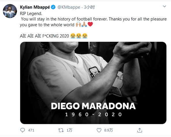 法國球星姆巴佩在推特上稱,“你將永遠留在足球史上。感謝你給全世界帶來的快樂”↓