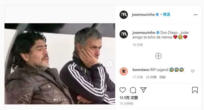 名帥穆里尼奧在ins上表達了對馬拉多納的哀悼。“想念你,迭戈,我的老朋友。”↓