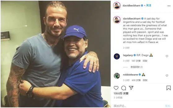 當天貝克漢姆在臉書上發文稱:“這對阿根廷來説是悲傷的一天,對足球來説也是悲傷的一天,當我們在慶祝這個男人給予我們的偉大(成就)…一個充滿激情和意志力(踢足球的)人,完全是個天才……見到迭戈我太激動了,我們都會想念他的,安息吧。”貝克漢姆還配了一張自己曾經和馬拉多納相擁在一起合照。