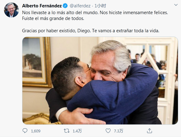 阿根廷總統發推:感謝迭戈,我們將用終生把你思念