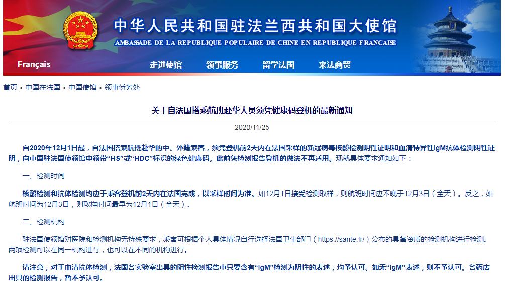 自2020年12月1日起,自法國搭乘航班赴華的中、外籍乘客,須憑登機前2天內在法國採樣的新冠病毒核酸檢測陰性證明和血清特異性IgM抗體檢測陰性證明,向中國駐法國使領館申領帶“HS”或“HDC”標識的綠色健康碼。此前憑檢測報告登機的做法不再適用。