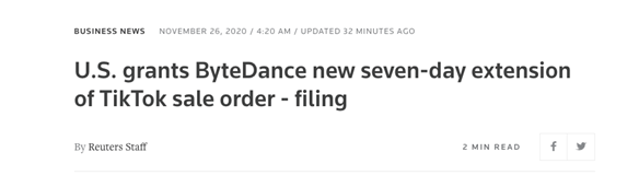 此前,針對8月頒佈的行政令,特朗普政府已給予字節跳動15天的延期,直至本週五到期。TikTok方面表示,該行政令的最新期限為12月4日。在美國政府的壓力之下,字節跳動為敲定與沃爾瑪和甲骨文的交易以將TikTok美國資產轉移到新的實體中,已經進行了數月的談判。美國財政部未在週三立即發表評論。