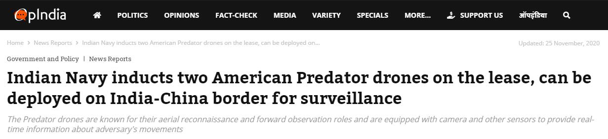 報道最後提到,鑑於目前中印邊境的緊張局勢,無人機將成為密切監視這一地區的重要工具,目前租借的兩架“捕食者”無人機將為印度軍隊提供使用這些先進無人機經驗。