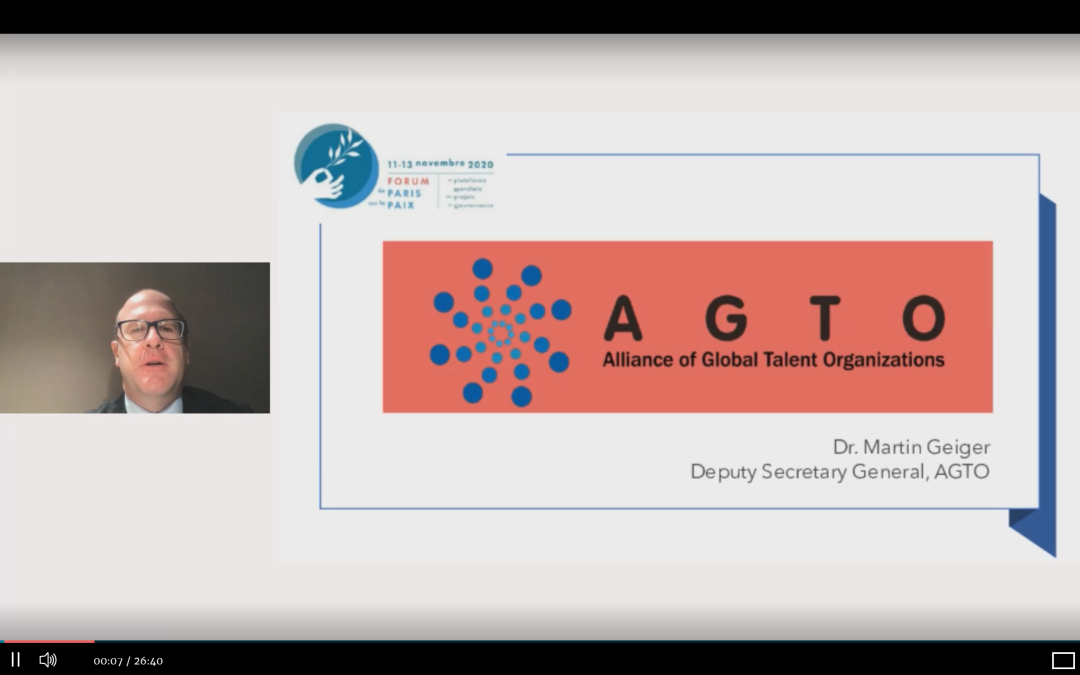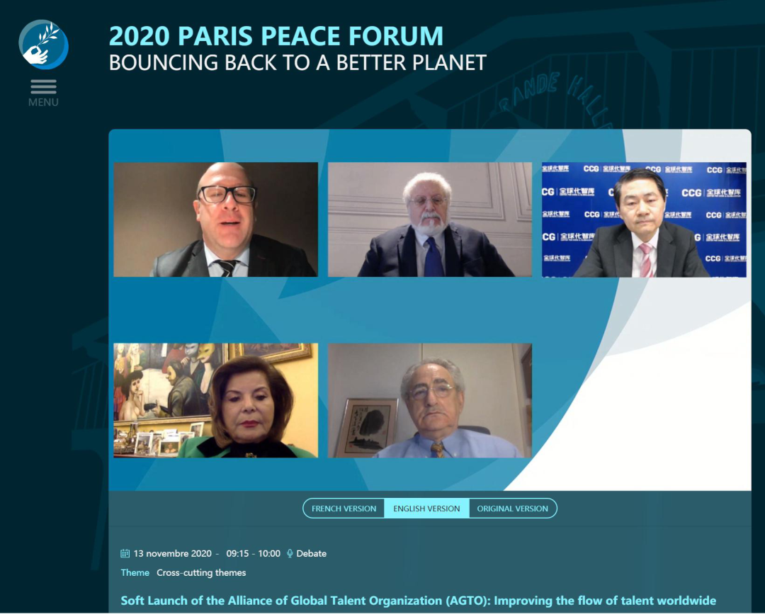 2020年11月11日至13日,第三屆巴黎和平論壇在法國巴黎舉行。由全球化智庫(CCG)倡議的國際人才組織聯合會(Alliance of Global Talent Organizations AGTO)在本屆論壇上舉行了成立儀式,並就國際人才組織聯合會未來將如何推動全球人才流動治理創新進行了研討。