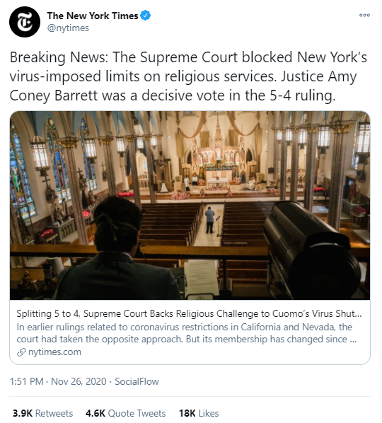 此前,雖然大量美國公共衞生專家和專業機構都指出,宗教場所因為容易出現大量人羣聚集,很容易導致新冠肺炎疫情的傳播和擴散,但這5名思想保守的大法官卻認為如果紐約州政府允許自行車店和賣酒的商店開門,那麼就應該“公平地”讓宗教場所也開門,否則就是偏向世俗而忽視信仰自由。