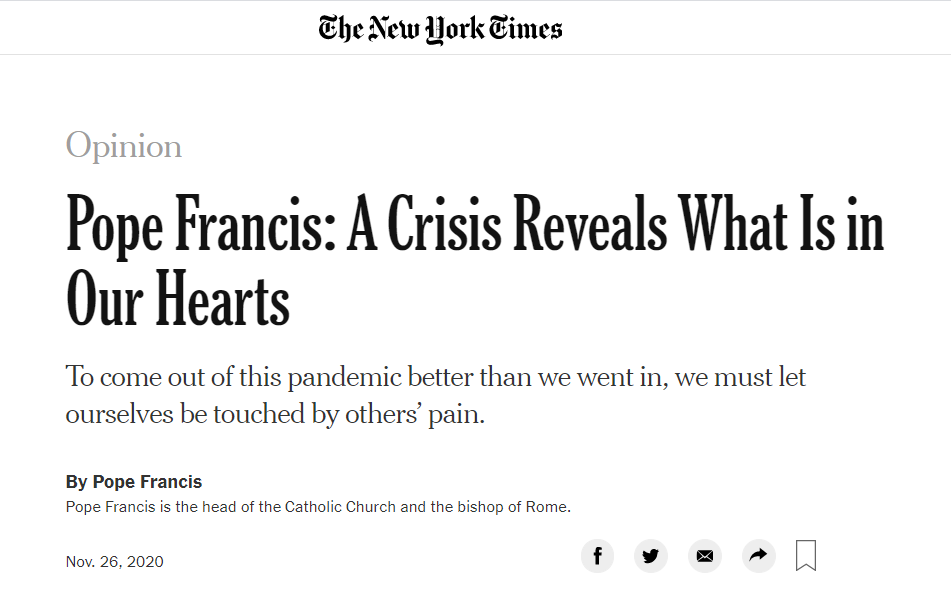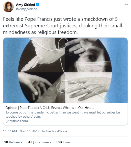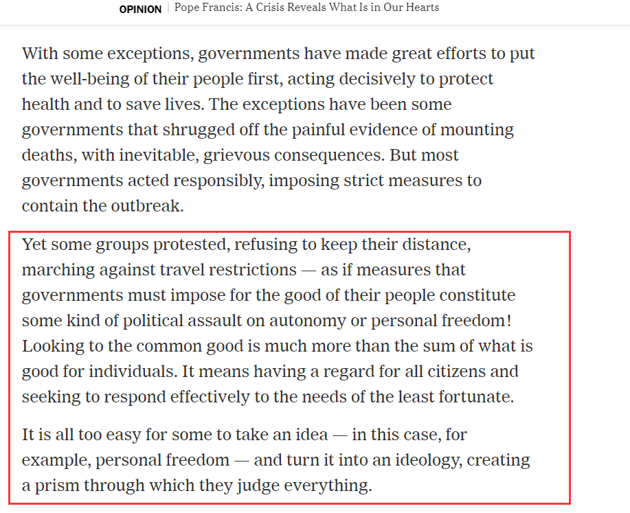然而,就在此事在美國引起強烈爭議後,羅馬教皇方濟各卻在《紐約時報》上撰文一篇,批判了該裁決背後那種濫用自由給防疫工作添亂的自私心態。