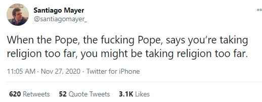 另一位美國媒體人則表示:“當教皇——教皇啊!——説你們把宗教搞得太過分的時候,你們可能真的搞得太過分了”。