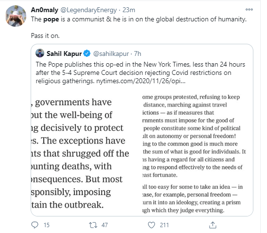 可遺憾的是,那些堅持要反對防疫措施、認為新冠疫情並不嚴重的美國極端保守派網民,並沒有被教皇方濟各所説動。