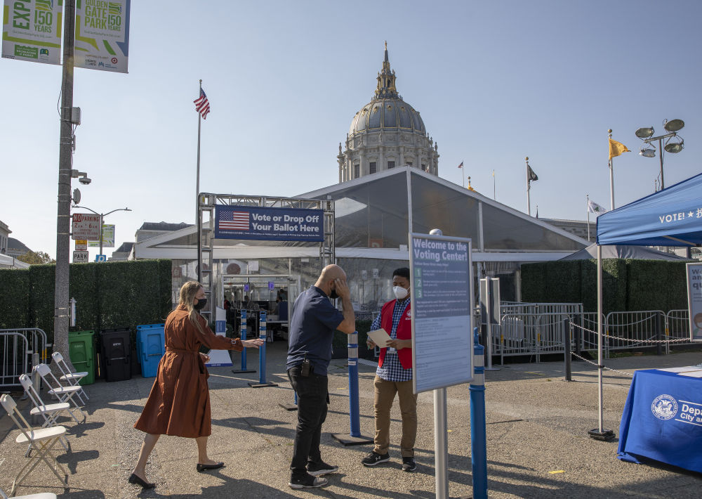 10月5日,美國舊金山市政廳工作人員在户外投票中心工作。為防範新冠疫情,舊金山在市政廳外設立户外投票中心。(新華社發 李建國攝)