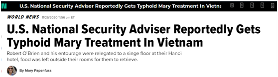 轉引彭博社報道的《赫芬頓郵報》26日在標題裏説,“據報道,美國國家安全事務助理在越南被當做‘傷寒瑪麗’(Typhoid Mary)對待”。“傷寒瑪麗”是傳染病學史上最有名的無症狀感染者,這名生於1869年的美國女傭攜帶傷寒桿菌,但一直沒有症狀,每到一户人家做廚師,就會引發多人染上傷寒病。流行病學調查最終鎖定這名無症狀感染者,醫生使用各種藥物,但傷寒桿菌一直頑強地存在於她的體內。