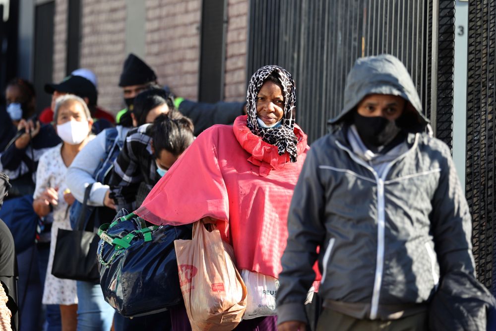 11月25日,在感恩節前夕,人們在美國洛杉磯一處為無家可歸者免費提供感恩節食物的地點排隊等待。(新華社/路透)