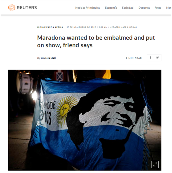 (路透社:馬拉多納的朋友説,馬拉多納曾想(對自己的遺體)做防腐處理,然後展陳)
