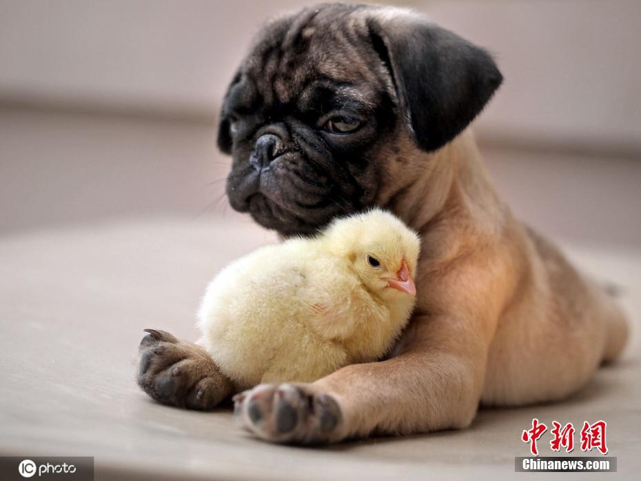 呆萌的小狗狗寵溺地將一隻小雞崽抱在胸前。圖片來源:東方IC 版權作品 請勿轉載
