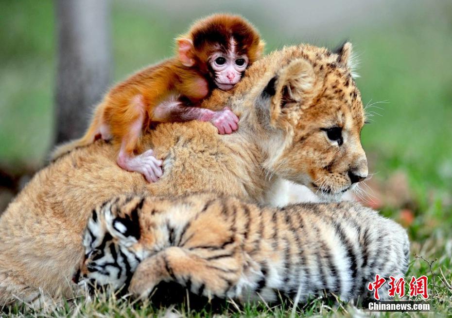 動物園內的一隻獅寶寶和一隻虎寶寶依偎在一起,獅寶寶的背上還趴了個一臉小可憐的小猴子。圖片來源:東方IC 版權作品 請勿轉載