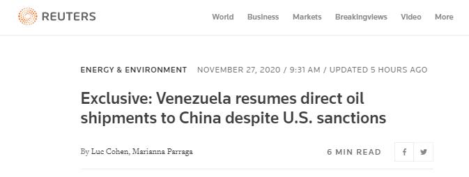 路透社稱,中國國有企業中國石油天然氣集團有限公司(CNPC)和其下屬子公司中國石油天然氣股份有限公司(PetroChina)長期以來一直是委內瑞拉國家石油公司(PDVSA)的主要客户。2019年8月,上述公司停止在委內瑞拉港口裝載原油和燃料,此前美國擴大了對委內瑞拉國家石油公司的制裁,將範圍擴大到任何與這家國有企業進行貿易的公司。