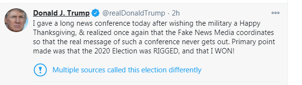 “在祝軍人感恩節快樂後,我開了一個(時間)挺長的記者會,並且再一次意識到假新聞媒體都勾結在一起,讓這樣的記者會的真實信息發不出去。(我在記者會回答提問的)主要觀點是,2020大選被操縱了,並且我贏了!”特朗普在推特上寫道,並將“操縱”和“贏了”兩個詞大寫。