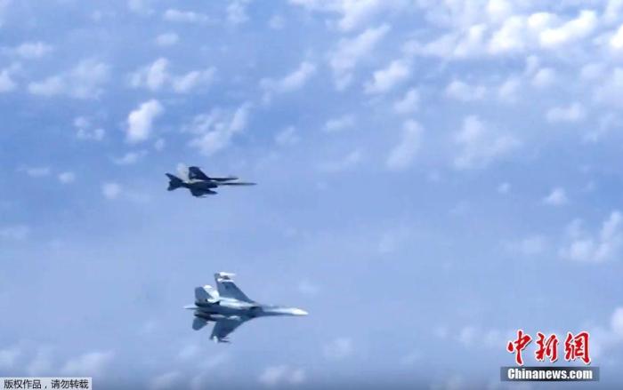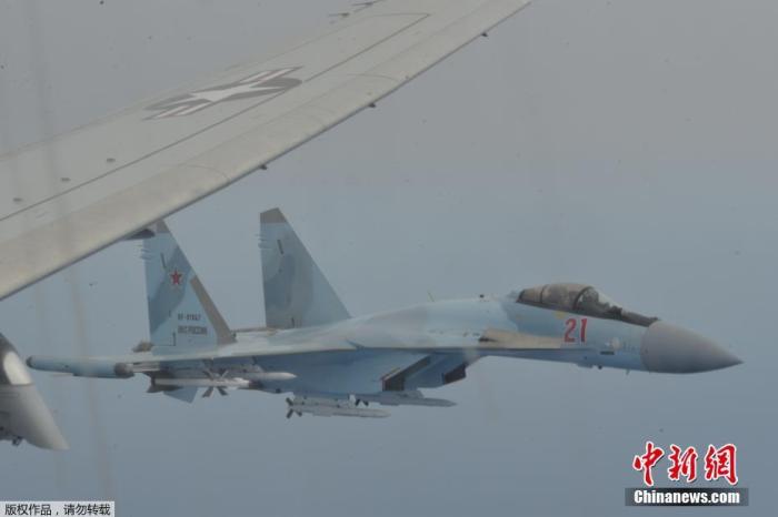 資料圖:當地時間2020年5月26日,兩架俄羅斯蘇-35戰鬥機中的一架,伴隨美國海軍P-8A反潛波塞冬巡邏機飛行。