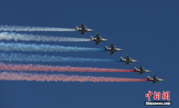 資料圖:當地時間2020年7月26日,俄羅斯多地舉行閲兵,慶祝海軍節。俄羅斯海軍司令部所在地聖彼得堡是此次海軍節閲兵活動主場。46艘艦艇和41架直升機和固定翼飛機參加了活動。中新社記者 王修君 攝
