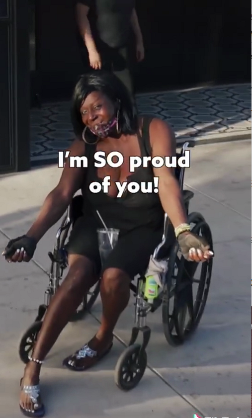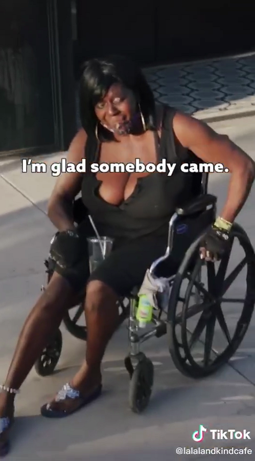 一位坐在輪椅上的女士路過時,當小哥大聲地告訴她,“你很漂亮,你的眼睛很好看”之後,