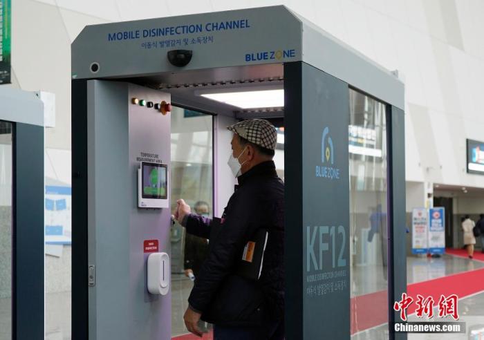 圖為在京畿道高陽市某會議中心內,人員需要通過移動測温消毒通道,進行防疫檢查。中新社記者 曾鼐 攝