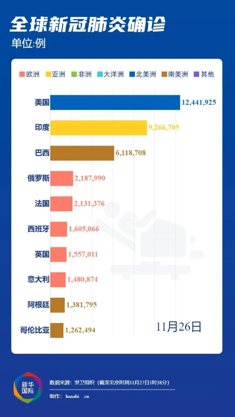 美國約翰斯·霍普金斯大學:截至北京時間27日7時27分,全球新冠確診病例達60851988例,死亡病例為1429643例。美國是全球疫情最嚴重的國家,確診病例達12877783例,死亡病例為263394例。