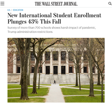 美國國際教育研究所(Institute of international Education)日前發佈的最新報告顯示,今年秋季美國校園的國際新生人數鋭減43%,而外國學生的註冊率總體下降16%。更加全面反映今秋數據的報告將於明年公佈,該報告囊括近3000所學校的入學情況,包括在美國校園的外國學生,以及在美國或海外進行線上學習的學生。