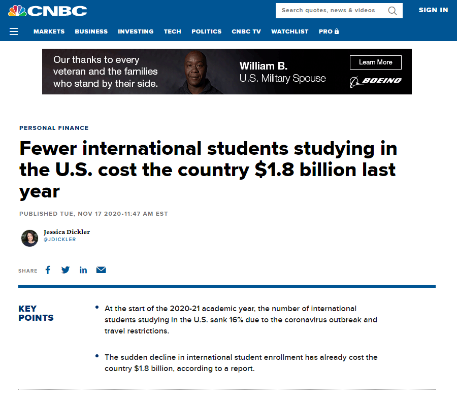 國際教育工作者協會(Association of International Educators)的另一份報告顯示,去年國際學生入學人數的突然下降,已經讓美國經濟損失了18億美元。美國高校有100多萬國際學生,在2019-2020年間,他們為美國經濟貢獻了387億美元。然而,該報告發現,這一財政貢獻較上一學年下降了4%以上,這是該非營利組織20多年前開始收集數據以來首次出現下降。