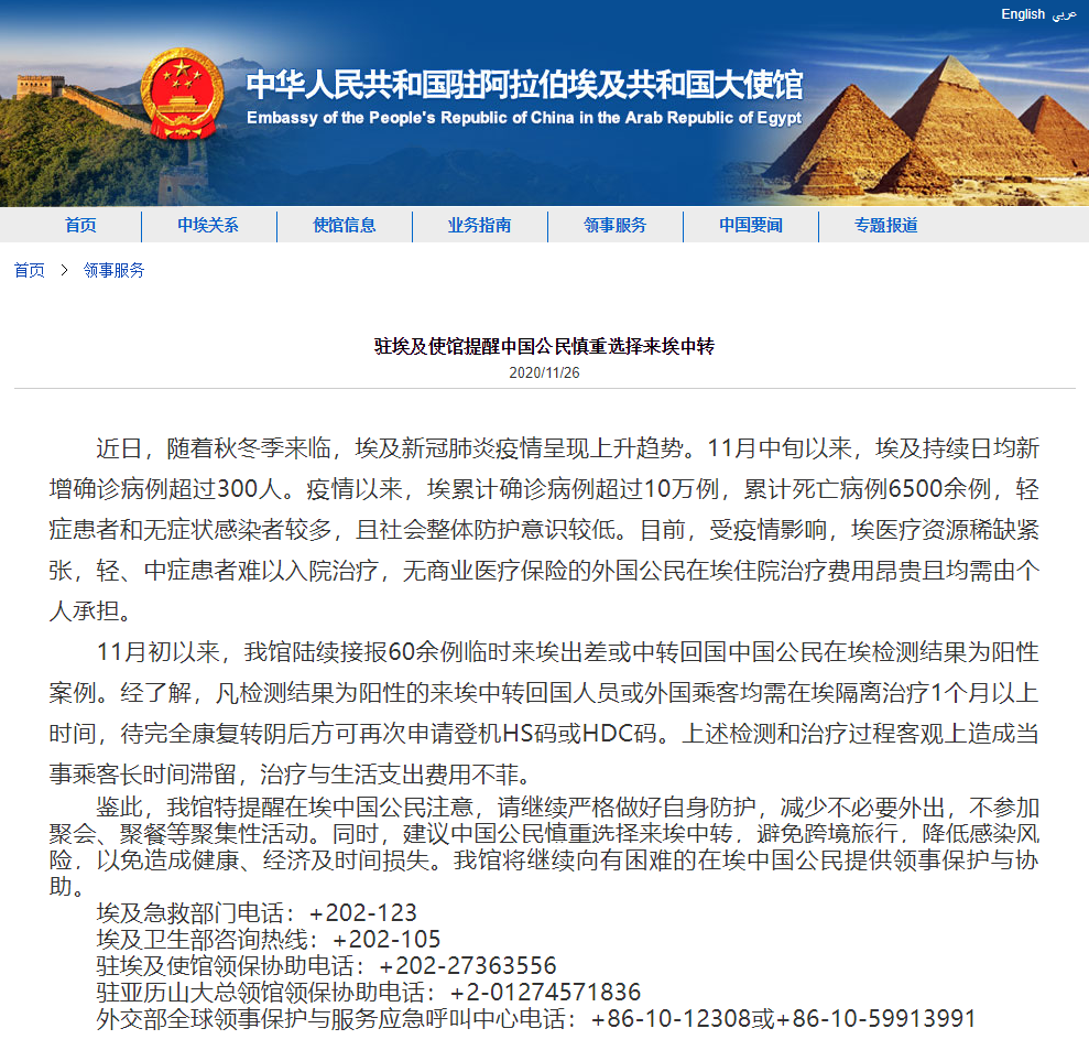 近日,隨着秋冬季來臨,埃及新冠肺炎疫情呈現上升趨勢。11月中旬以來,埃及持續日均新增確診病例超過300人。疫情以來,埃累計確診病例超過10萬例,累計死亡病例6500餘例,輕症患者和無症狀感染者較多,且社會整體防護意識較低。目前,受疫情影響,埃醫療資源稀缺緊張,輕、中症患者難以入院治療,無商業醫療保險的外國公民在埃住院治療費用昂貴且均需由個人承擔。