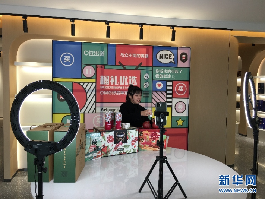 (工作人員正在為石榴、石榴飲品等產品進行直播帶貨。 新華網 於楊 攝)