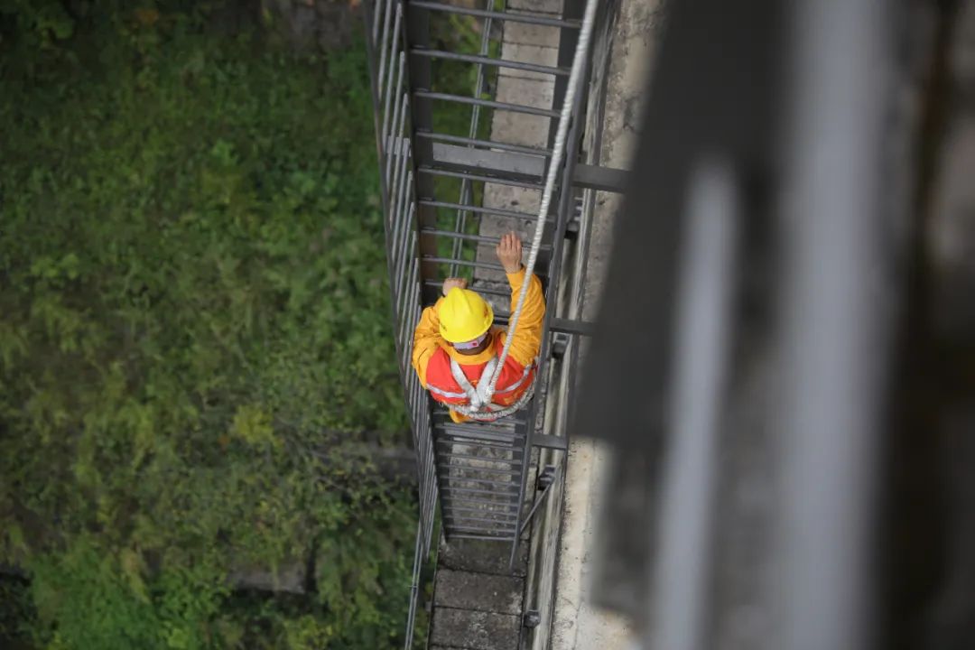 “大家從檢查梯下平台,一定要注意安全。”張寶等人沿着20米高、僅一人身寬的步梯往下爬,走動時步梯不停晃動。走下步梯,腳下是一條長10米、寬0.5米的步行板。他們要掀開步行板,檢查底下托架欄杆是否生鏽。