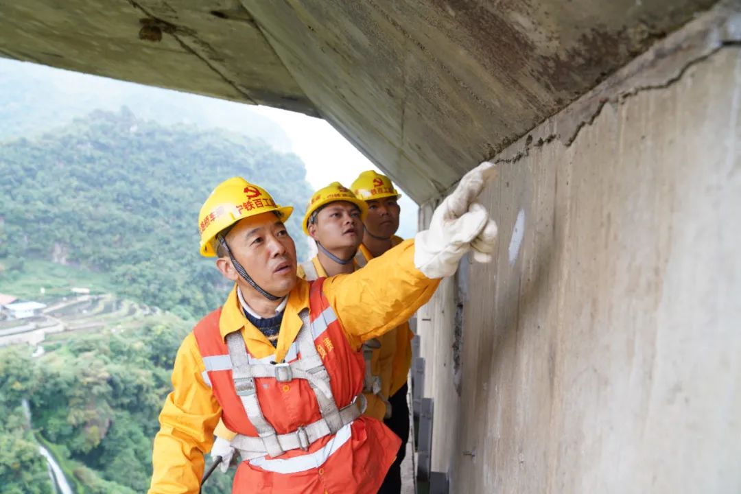 緊接着,張寶和大夥開始檢查橋墩的混凝土結構,並用手按壓橋墩壁,使用檢查錘敲擊橋墩檢查是否存在裂紋。如果橋墩有裂紋,他們要馬上用混凝土和砂漿材料修補。