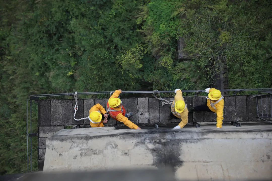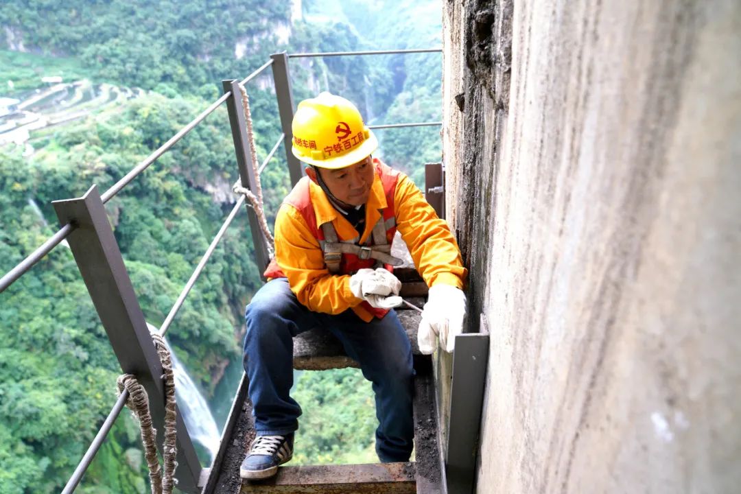 “工作第3年了,我最打怵的還是給欄杆除鏽,往下看令人頭暈目眩。峽谷的風從四面八方吹來,常常吹得人滿臉鐵鏽。”張寶的徒弟彭儀説。他將安全繩釦在欄杆上,左手緊緊抓着托架,右手拿着打磨機進行打磨。空氣中瀰漫着厚重的鐵鏽味,汗水順着彭儀的額頭流下。