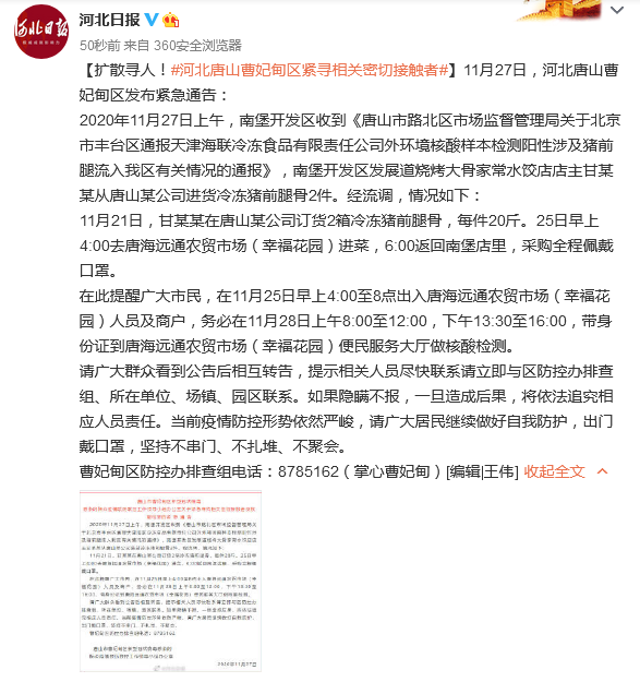 【擴散尋人!#河北唐山曹妃甸區緊尋相關密切接觸者#】11月27日,河北唐山曹妃甸區發佈緊急通告: