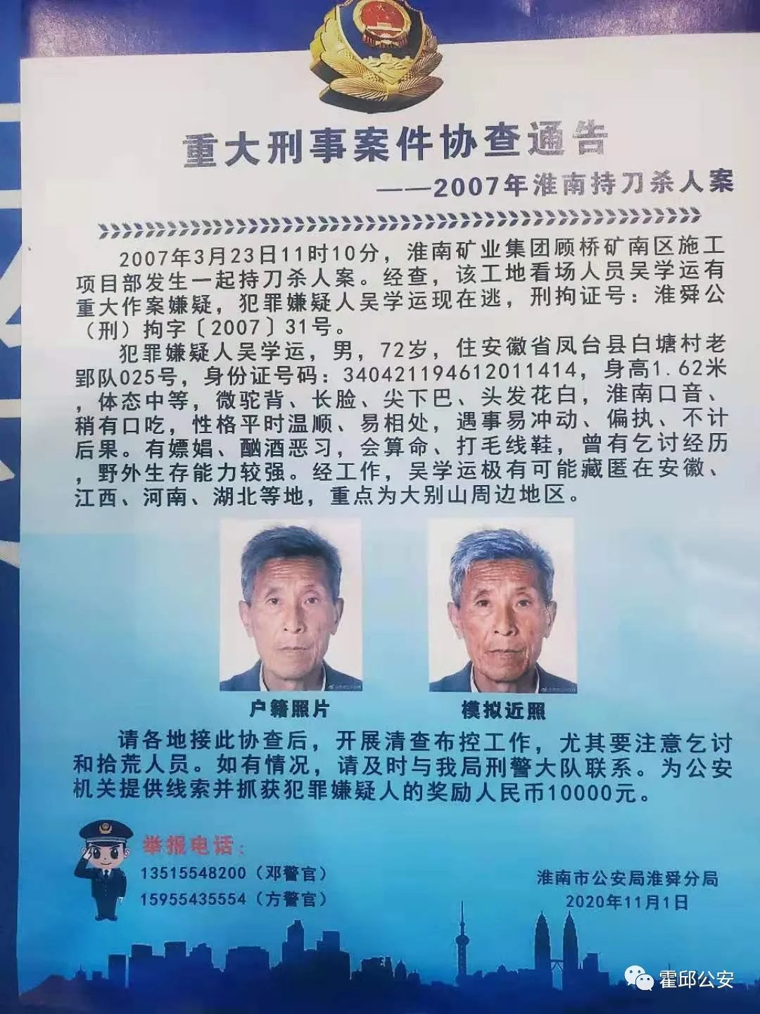 犯罪嫌疑人吳學運,男,72歲 ,住安徽省鳳台縣白塘村老郢隊025號,身份證號碼:340421194612011414,身高1.62米,體態中等,微駝背、長臉、尖下巴、頭髮花白,淮南口音、稍有口吃,性格平時温順、易相處,遇事易衝動、偏執、不計後果。有嫖娼、酗酒惡習,會算命、打毛線鞋,曾有乞討經歷,野外生存能力較強。經工作,吳學運極有可能藏匿在安徽、江西、河南、湖北等地,重點為大別山周邊地區 。