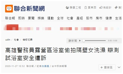 【環球網報道 記者 尹豔輝】據台灣《聯合報》11月27日報道,高雄市鳳山區一名陳姓警務人員與妻子,今年8月到台中市和平山區露營,陳姓警務人員涉嫌在露營區浴室頂端縫隙,偷拍林姓女子洗澡,陳姓男子卻辯稱以為隔壁間是他的妻子,用手機拍攝,用以測試露營浴室安全,台中地檢署今天(27日)依妨害秘密罪將他起訴。